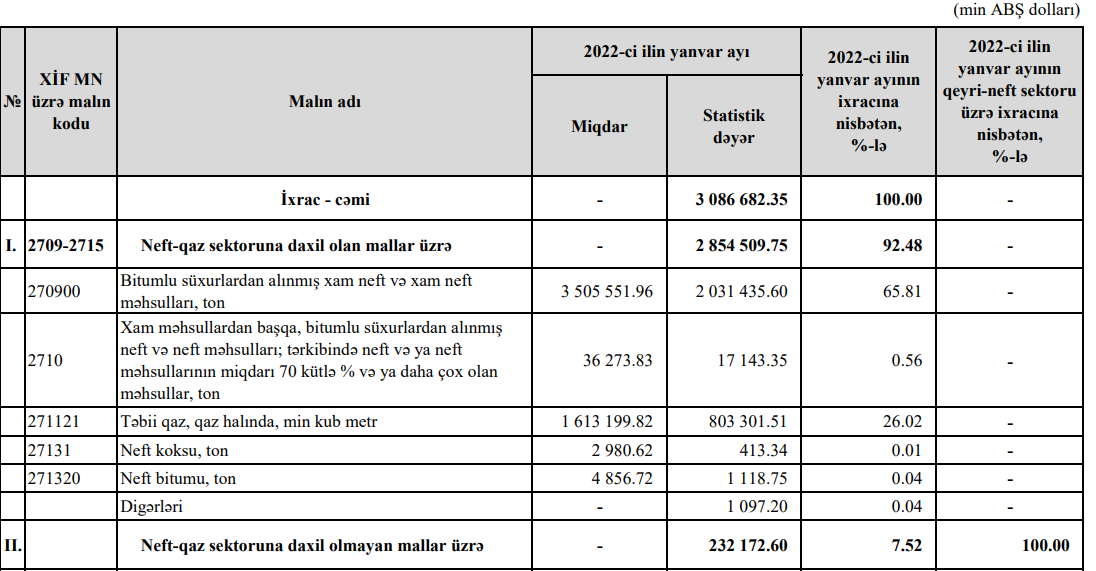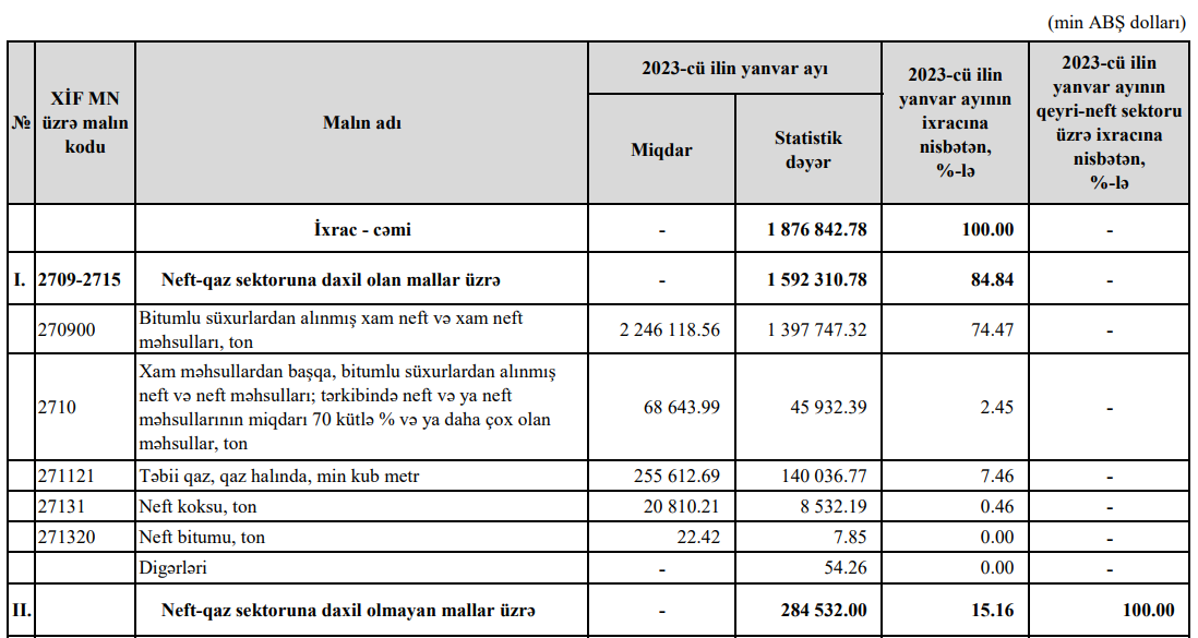 Neft-qaz sektoruna daxil olan malların ixracı 2023-cü ilin yanvar ayının ixracının 84,8%-ni təşkil edib. Ötən ilin yanvarında bu nisbət 92.48% idi.