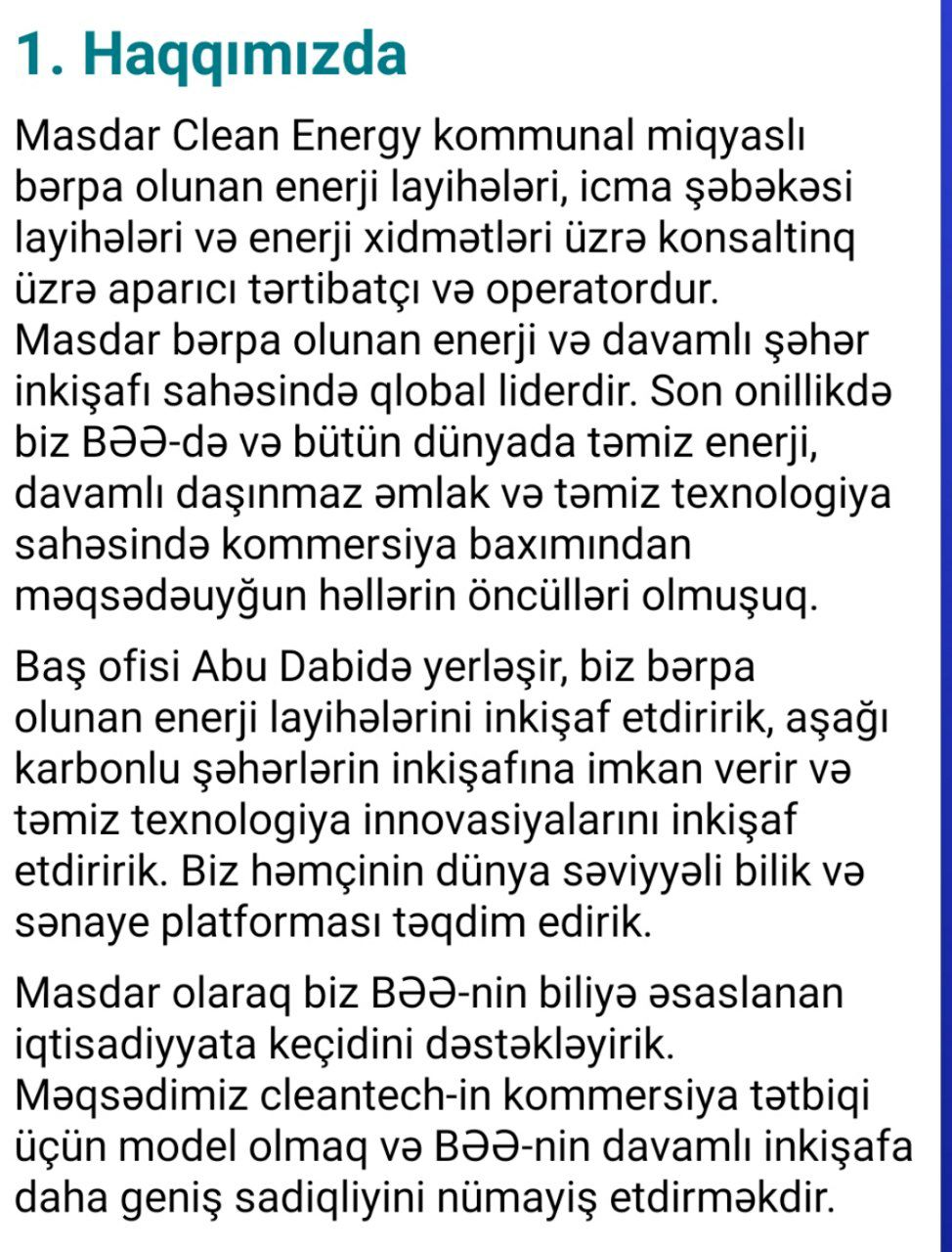 Birləşmiş Ərəb Əmirliklərinin “Masdar” şirkəti Azərbaycanda böyük investisiyalar yatırmaqdadır. Şirkət Azərbaycan hökumətinin dəstəyilə də günəş elektrik stansiyası layihəsini icra edir, külək elektrik stansiyası layihəsinin həyata keçirilməsi üçün saziş imzalayıb.