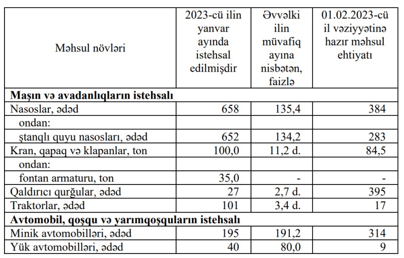 Ay ərzində əvvəlki ilin müvafiq ayı ilə müqayisədə traktorların istehsalı 3,4 dəfə artaraq 101 ədəd, yük avtomobillərinin istehsalı 20% azalaraq 40 ədəd təşkil edib.