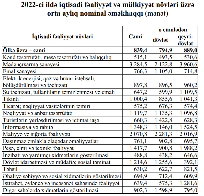 Marja.az Dövlət Statistika komitəsinə istinadən xəbər verir ki, əməkhaqqı neft-qaz sektorunda 3415,3 manat, qeyri neft-qaz sektorunda 790,2 manat təşkil etmişdir. Dövlət müəssisələrində çalışan işçilərin əməkhaqları 794,9 manat, özəl müəssisələrdə isə 889,0 manat olmuşdur.