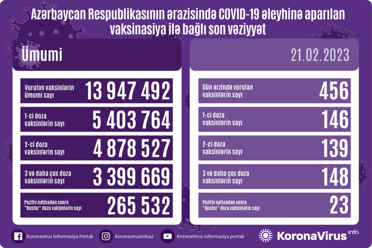 Azərbaycanda son sutkada koronavirus (COVID-19) əleyhinə 456 vaksin vurulub. Bir gündə birinci mərhələ üzrə vaksinasiya olunanların sayı 146, ikinci mərhələ üzrə vaksinasiya olunanların sayı 139, üç və daha çox doza üzrə vaksinasiya olunanların sayı 148, pozitiv nəticədən sonra buster doza üzrə vaksinasiya olunanların sayı 23 nəfərdir.