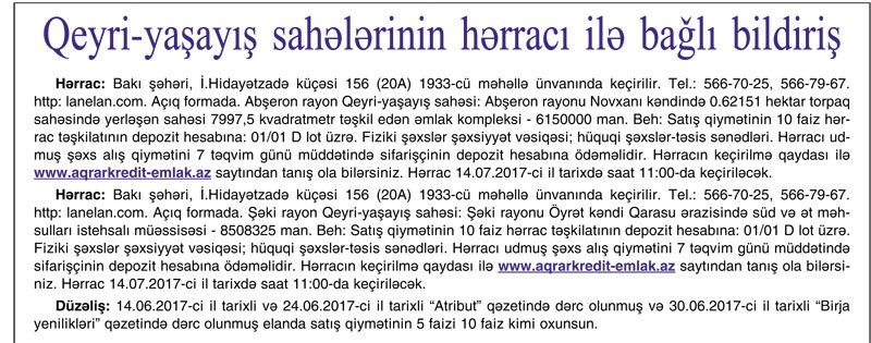 Hərrac 14.07.2017-ci il saat 11.00-da keçiriləcək. Hərrac: Bakı şəhəri, İ.Hidayətzadə küçəsi (20A) 1933- cü məhəllədə, 156 nömrəli ünvanda keçirilir. Tel: 566-70-25, 566-79-67. http:1anelan.com.