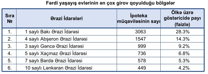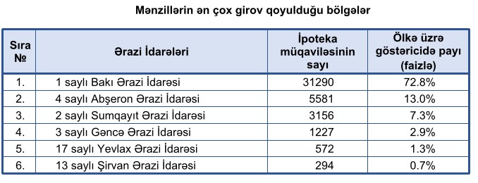 Daşınmaz əmlak üzrə ən çox ipoteka müqaviləsi paytaxt Bakıda bağlanıb. Ötən il ərzində paytaxtda ümumilikdə 40.454 ipoteka müqaviləsi bağlanılıb ki, bu da ölkə üzrə ümumi göstəricinin 55,4%-ni təşkil edir. Bakıdan sonra ən çox ipotekanın dövlət qeydiyyatı Əmlak Məsələləri Dövlət Xidmətinin “Daşınmaz Əmlakın Dövlət Kadastrı və Reyestri” publik hüquqi şəxsin 4 saylı Abşeron (8959 müqavilə), 2 saylı Sumqayıt (4714 müqavilə), 3 saylı Gəncə (3207 müqavilə) və 5 saylı Xaçmaz ərazi idarələrində (3009 müqavilə) aparılıb. Həmçinin, 17 saylı Yevlax və 13 saylı Şirvan ərazi idarələri də daşınmaz əmlakın ən çox girov qoyulduğu bölgələr sırasındadır. Bunu, həm də bölgədəki iqtisadi aktivliyin göstəricilərindən biri kimi qiymətləndirmək olar.