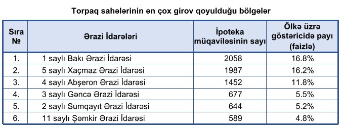 Ötən il ərzində ən çox torpaq sahəsinin girov qoyulduğu ərazilər sırasında ilk üçlüyü müvafiq olaraq 1 saylı Bakı, 5 saylı Xaçmaz və 4 saylı Abşeron ərazi idarələri tamamlayır. Torpaqların ən az girov qoyulduğu bölgələr isə 8 saylı Cəlilabad (228 müqavilə) və 10 saylı Lənkəran (286 müqavilə) ərazi idarələridir.