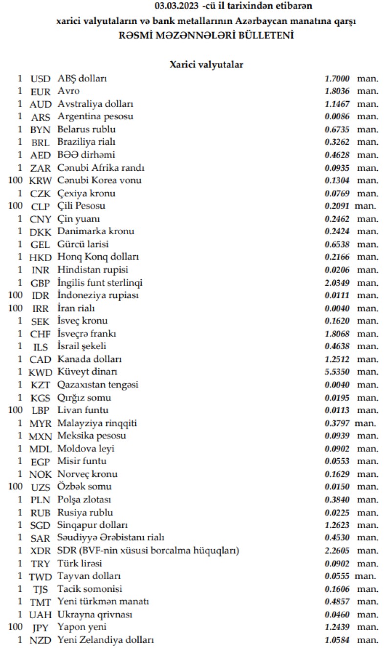 Dolların bazar ertəsi üçün rəsmi məzənnəsi müəyyən olunub