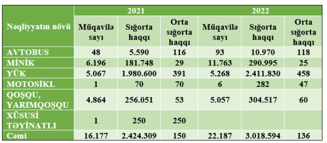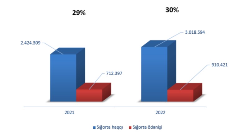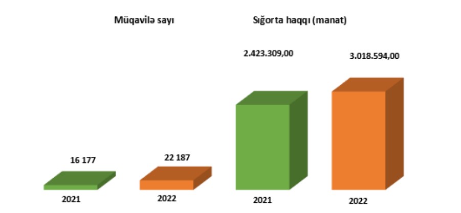 2022-ci ilin müvafiq dövründə isə 22 187 sığorta müqaviləsi rəsmiləşdirilmiş və həmin müqavilələr üzrə 3.018.594 manat sığorta haqqı toplanmışdır. 2021-ci il ərzində isə 16 177 sığorta müqaviləsi rəsmiləşdirilmiş və 2.423.309 manat sığorta haqqı toplanmışdı.