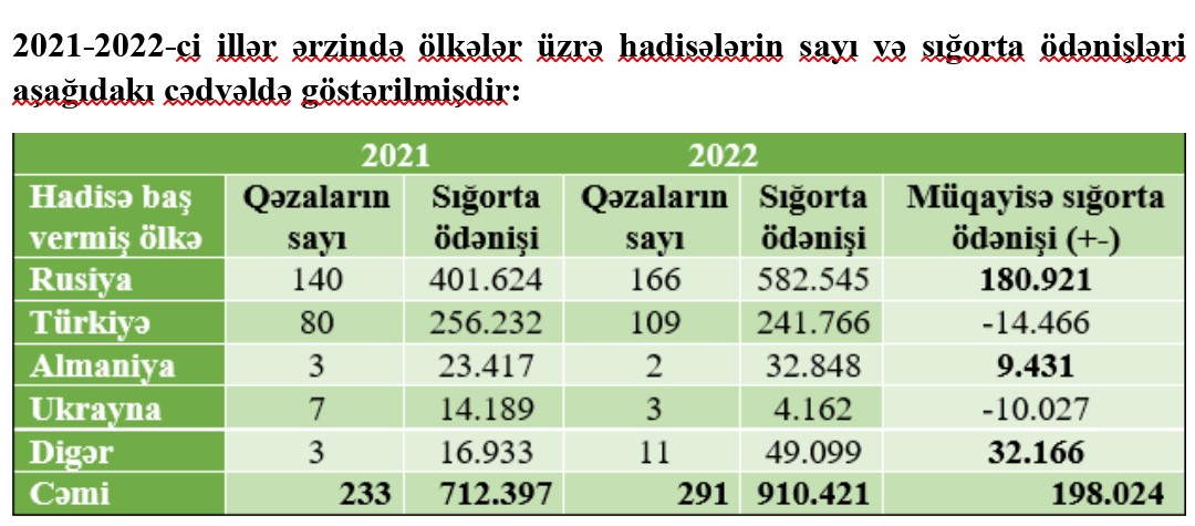 2021-ci il ərzində ölkə xaricində baş vermiş 233 yol-nəqliyyat hadisəsinə görə 712.397 manat, 2022-ci ilin müvafiq dövründə isə 291 yol-nəqliyyat hadisəsinə görə 910.421 manat sığorta ödənişi həyata keçirilmişdir. Beləliklə, sığorta ödənişlərinin həcmində 28%, sayında isə 25% artım müşahidə edilmişdir. 2021-ci il ərzində bir hadisə üzrə orta sığorta ödənişi 3.057 manat, 2022-ci il ərzində isə 3.128 manat təşkil etmişdir. 2021 və 2022-ci illər ərzində hadisələrin baş verdiyi ölkələr əsasən Rusiya və Türkiyə olmuşdur. Rusiyada baş verən hadisələr üzrə 2021-ci ildə verilmiş orta sığorta ödənişləri 2.869 manat, 2022-ci ildə isə 3.509 manat təşkil etməklə təxminən 22% artmışdır.