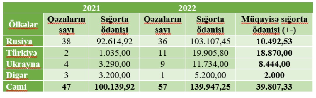Beynəlxalq Yaşıl Kart Sisteminə üzv və xaricdə qeydiyyata alınmış nəqliyyat vasitələrinin 2021-ci il ərzində ölkə daxilində törətdikləri 47 yol-nəqliyyat hadisəsinə görə 100.139,92 manat, 2022-ci ilin müvafiq dövründə isə 57 yol-nəqliyyat hadisəsinə görə 139.947,25 manat sığorta ödənişi həyata keçirilmişdir. 2021-ci il ərzində bir hadisə üzrə orta sığorta ödənişi 2.130 manat, 2022-ci il ərzində isə 2.455 manat təşkil etmişdir. Beləliklə, orta sığorta ödənişi 15% artmışdır.