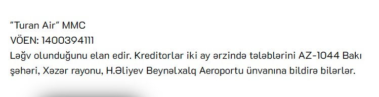Marja.az xəbər verir ki, 2 milyon 470 min manat nizamnamə kapitalına malik olan "Turan Air" MMC ləğv olunduğunu elan edib.