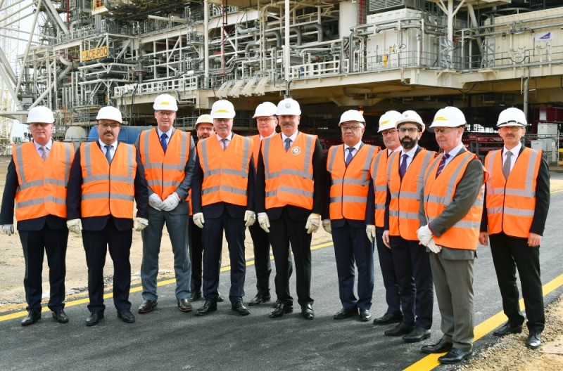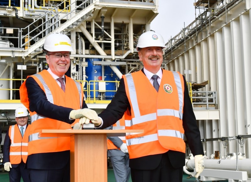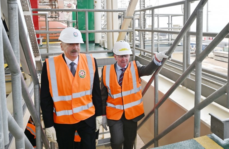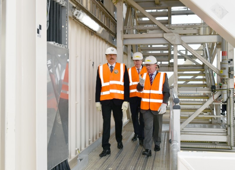 Prezident İlham Əliyev və BP-nin Azərbaycan, Gürcüstan və Türkiyə üzrə regional prezidenti Qəri Counz “Azəri-Mərkəzi-Şərqi” platformasının üst modulları qurğusunun dənizə rəmzi yola salınmasını bildirən düyməni basdılar.