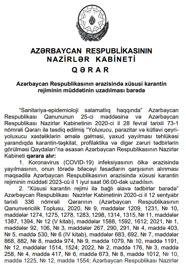 Qərara əsasən, koronavirus (COVID-19) infeksiyasının ölkə ərazisində yayılmasının, onun törədə biləcəyi fəsadların qarşısının alınması məqsədilə Azərbaycan ərazisində xüsusi karantin rejiminin müddəti 2023-cü il 1 iyul saat 06:00-dək uzadılıb.