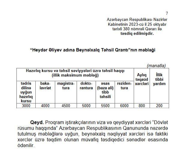“Marja” xəbər verir ki, bu, Baş nazir Əli Əsədovun imzaladığı “Heydər Əliyev adına Beynəlxalq Təhsil Qrantı”nın verilməsi Qaydasının və həmin təhsil qrantının məbləğinin təsdiq edilməsi haqqında qərarda əksini tapıb.