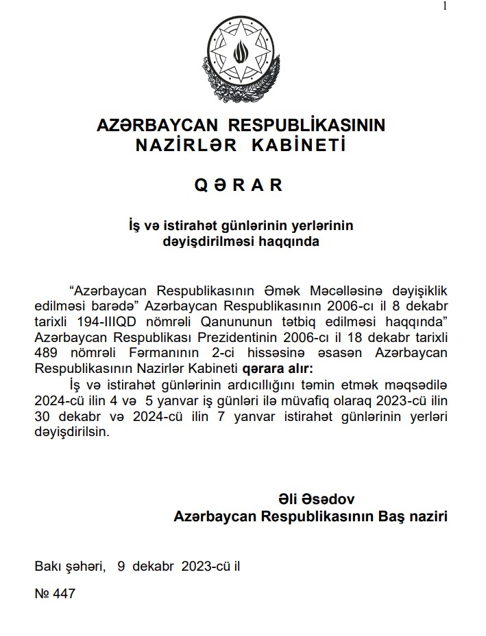 Qərara əsasən, iş və istirahət günlərinin ardıcıllığını təmin etmək məqsədilə 2023-cü il 30 dekabr və 2024-cü il 7 yanvar istirahət günləri ilə müvafiq 4 yanvar və 5 yanvar iş günlərinin yerləri dəyişdirilib.