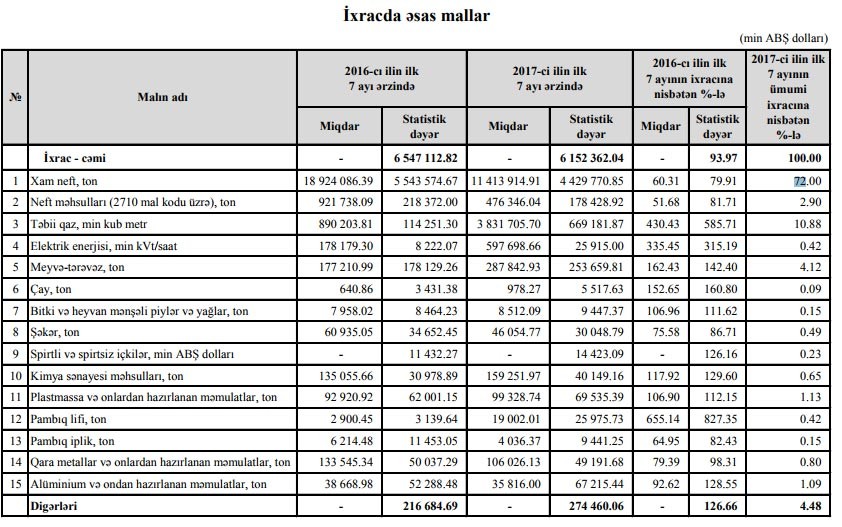 Azərbaycan 2017-ci ilin 7 ayı ərzində 4 milyard 429 milyon 770 min manatlıq xam neft ixrac edib. Bu, məbləğ 2016-cı ilin eyni dövrü ilə müqayisədə 20% azdır. Xam neft Azərbaycanın ixracının 72%-ni təşkil edib.