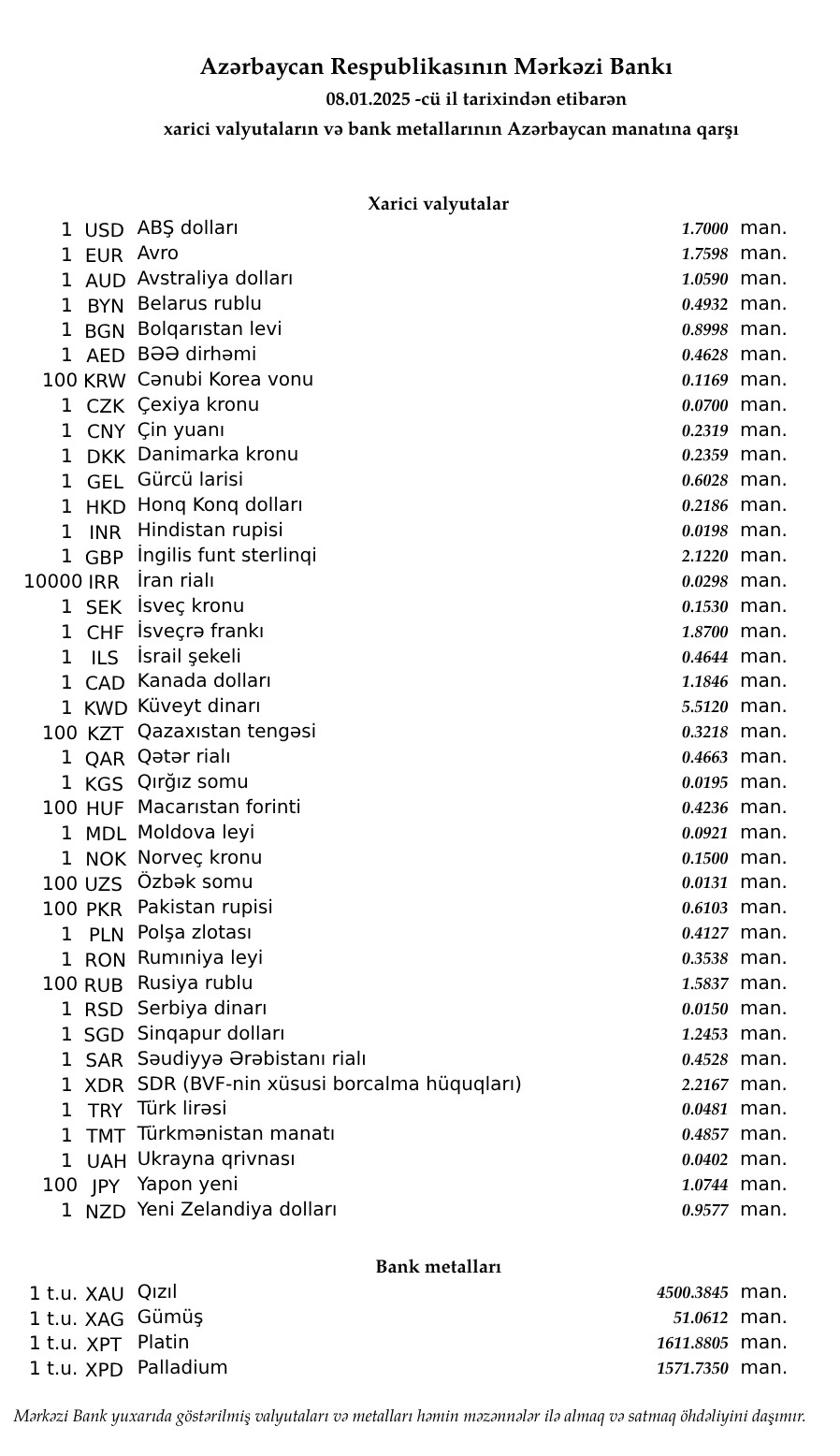 Mərkəzi Bank 2026-cı ilin ilk iş gününün rəsmi məzənnəsini açıqladı