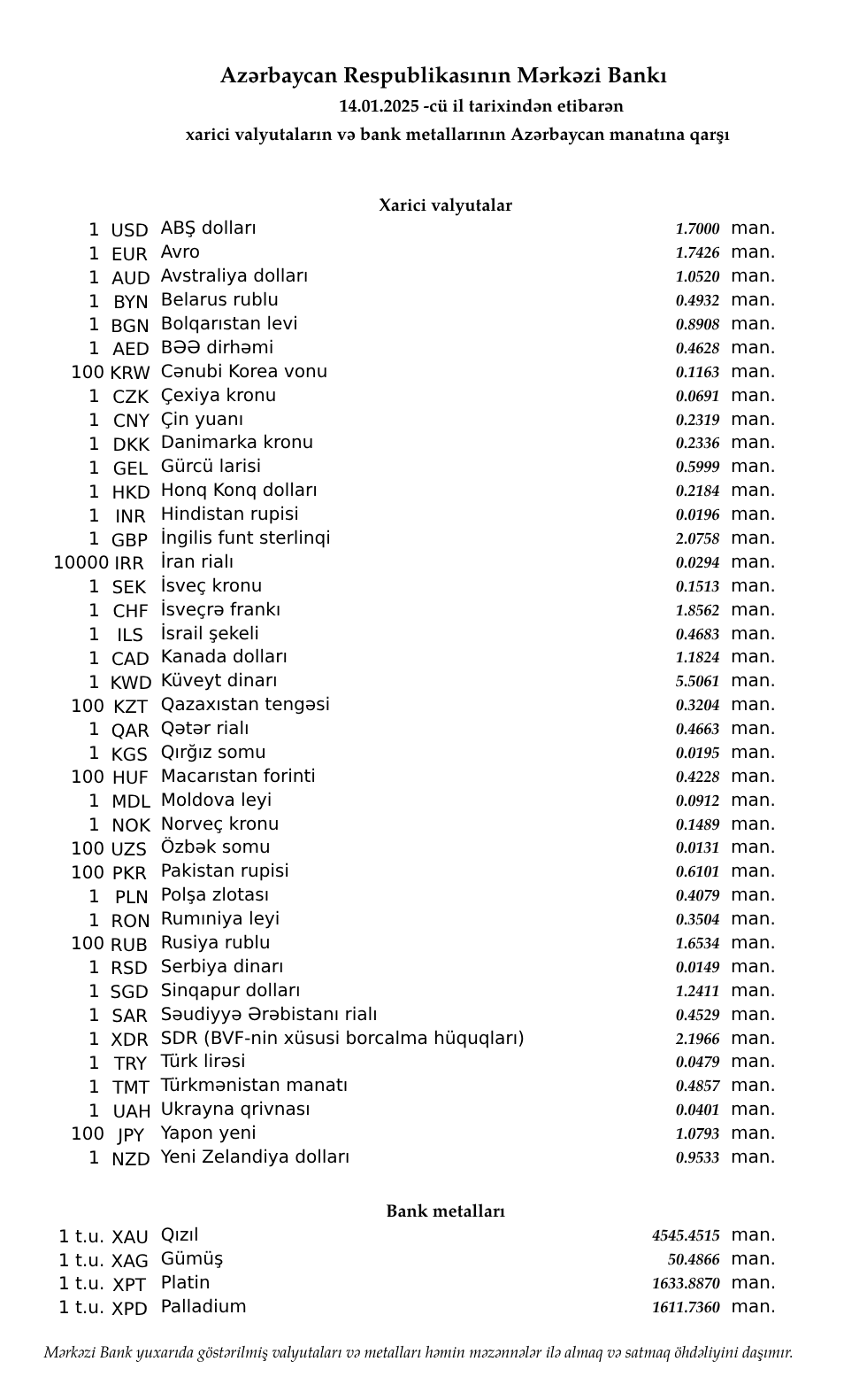 Mərkəzi Bank 2026-cı ilin ilk iş gününün rəsmi məzənnəsini açıqladı