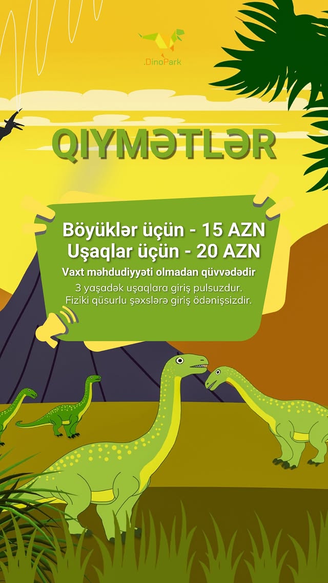 "Dino Park" bu gün məlumat yayaraq bəyan edib ki, 3 və daha çox uşağı olan ailələr üçün 20% endirim tətbiq oluncaqdır. Bunun üçün təsdiqedici sənəd təqdim edilməlidir.Yaxın günlərdə Hava Limanı yolu üzərində yerləşən Baku Expo Center-də "Dino Park" açılacaq.