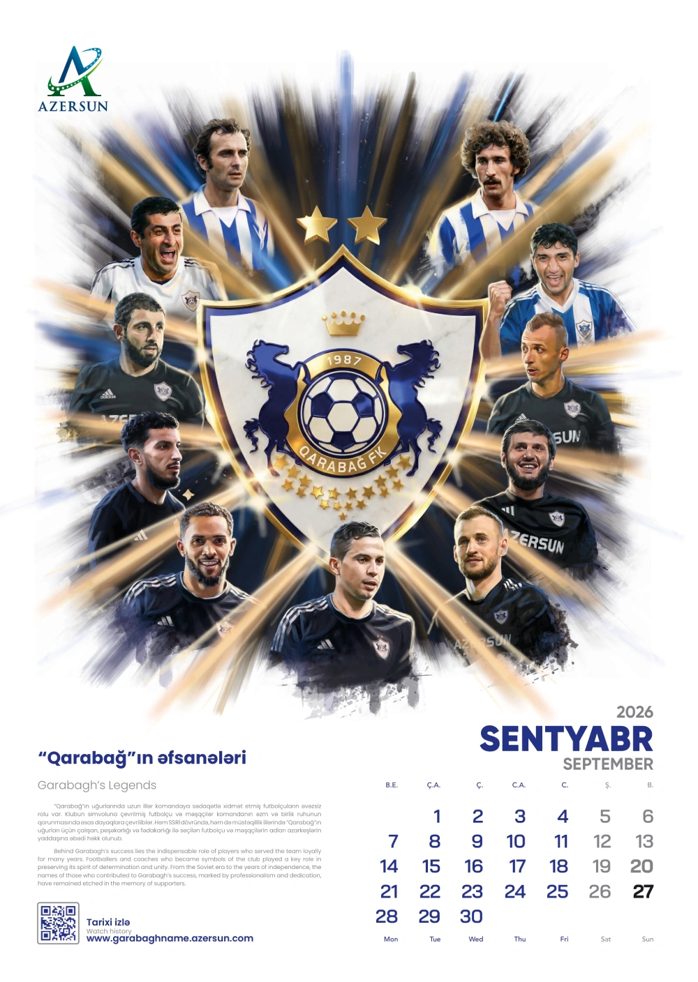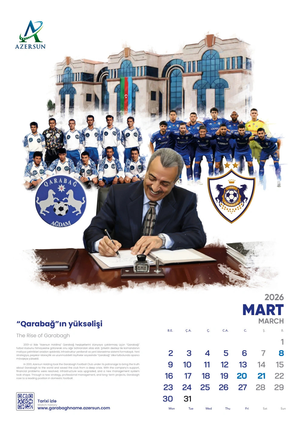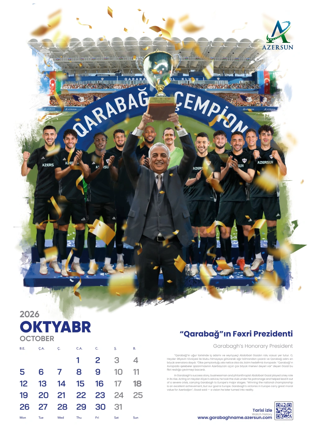 (®) “Azərsun Holdinq” ənənəsinə sadiq qalaraq növbəti illik təqvimini çap etdirib. 2026-cı il üçün hazırlanan bu təqvim son illərdə futbol sahəsində qızıl dövrünü yaşayan “Qarabağ” futbol klubuna həsr olunub.