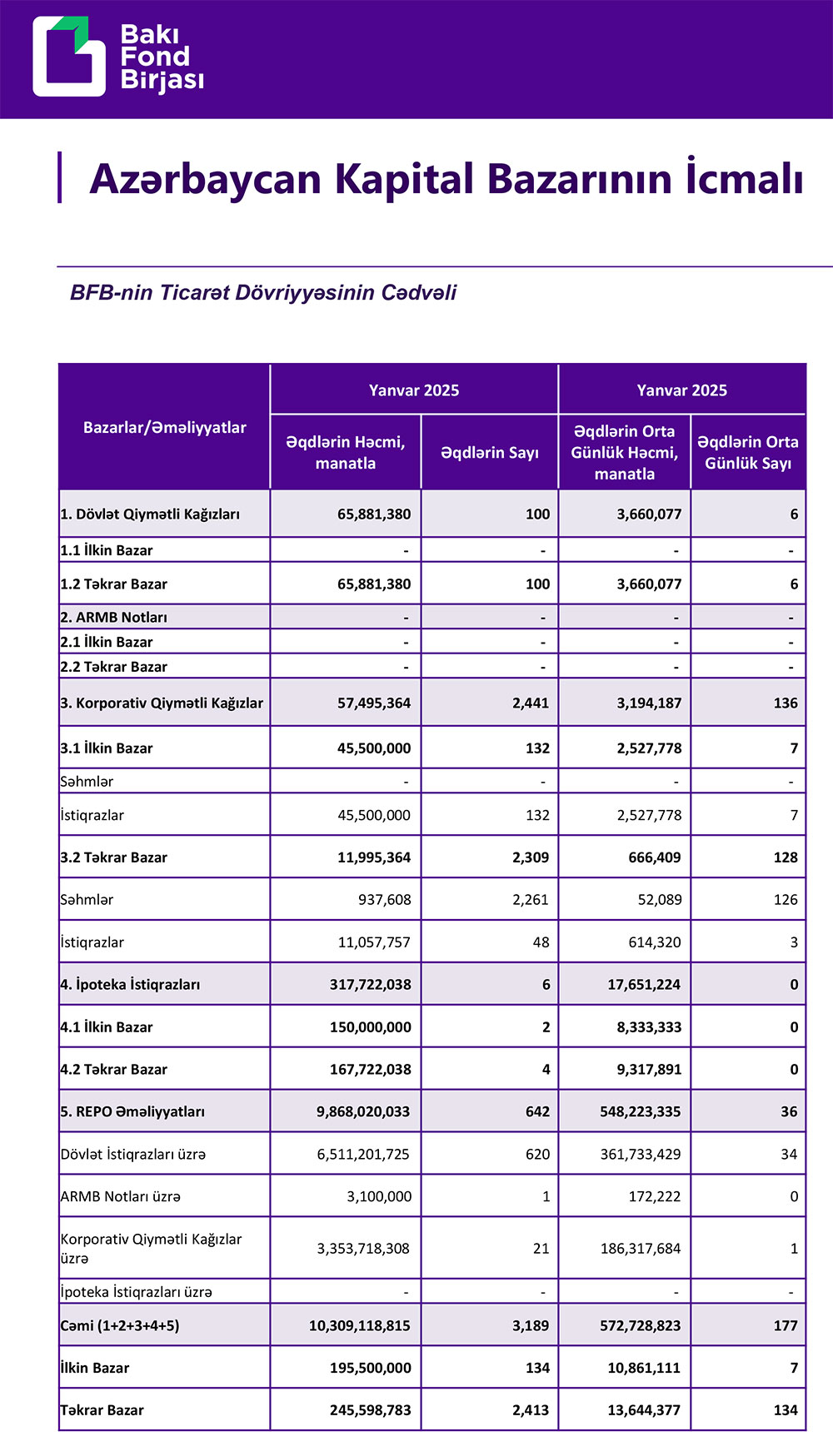 2025-ci ilin Yanvar ayında Bakı Fond Birjasınının cəmi ticarət dövriyyəsinin məbləği 10 milyard 309 milyon 119 min manat təşkil etmişdi.