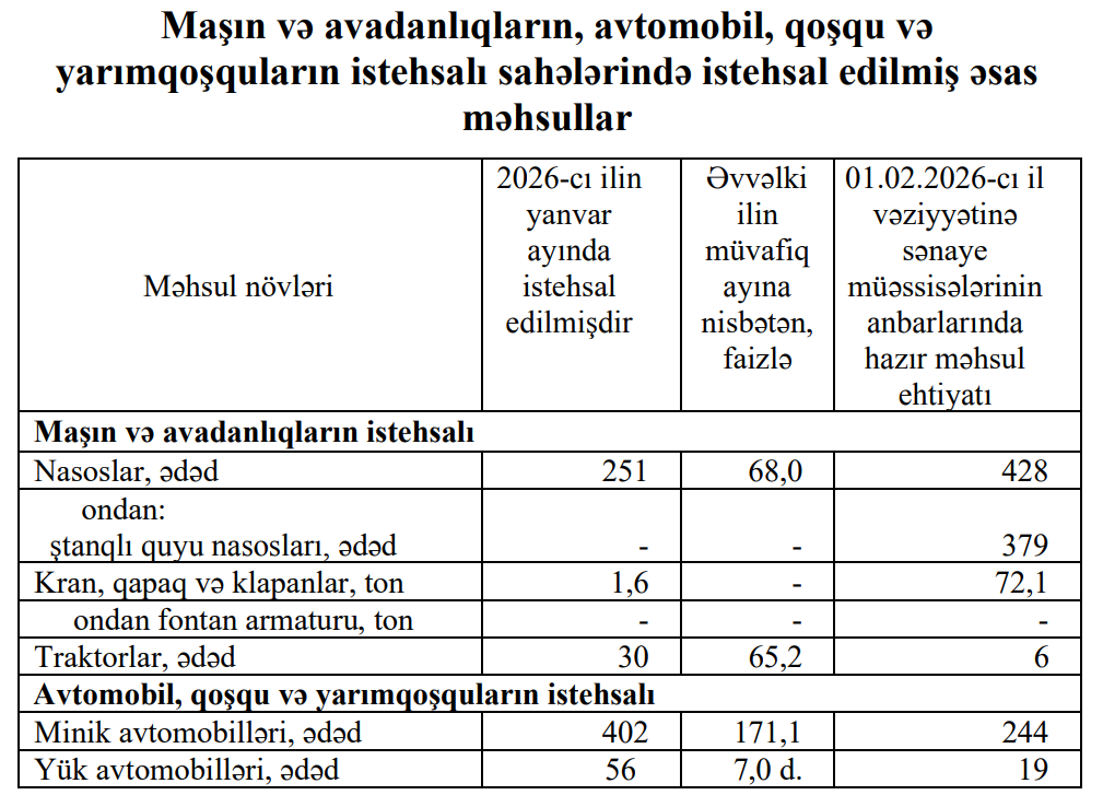 2026-сı ilin yanvar ayı ərzində əvvəlki ilin müvafiq ayı ilə müqayisədə yük avtomobillərinin istehsalı 7 dəfə artaraq 56 ədəd, traktorların istehsalı isə 34,8% azalaraq 30 ədəd təşkil edib.
