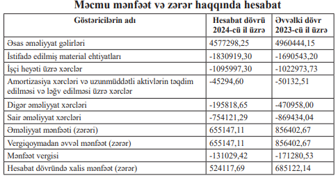Şirkətin illik gəlirləri 4 milyon 960 min manatdan 4 milyon 577 min manata, xalis mənfəəti isə 685 min manatdan 524 min manata düşüb.