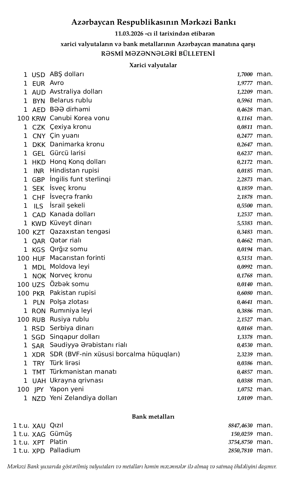 Rəsmi məzənnələr açıqlandı