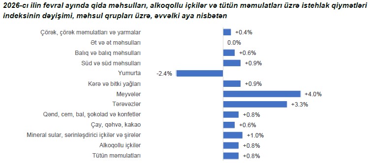 2026-cı ilin fevral ayında qida məhsulları, alkoqollu içkilər və tütün məmulatları üzrə istehlak qiymətləri əvvəlki aya nisbətən 1,1 faiz, yanvar-fevral aylarında isə əvvəlki ilin müvafiq dövrünə nisbətən 7 faiz artmışdır.