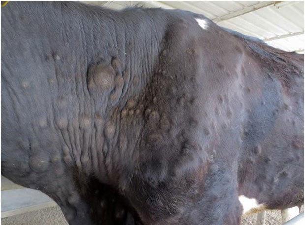 Xəstəliyin ağır formasında uzun müddətli isitmə, iştahanın kəsilməsi, arıqlama baş verir. Bədən nahiyəsinin hər yerində və görünən selikli qişalarında düyünciiklər əmələ gəlir, xəstəliyin ağırlaşma dövründə traxeyanın, udlağın zədələnməsi və bronxopnevmoniyanm nəticəsində heyvanlarda asfiksiya müşahidə olunaraq ölüm baş verə bilər.