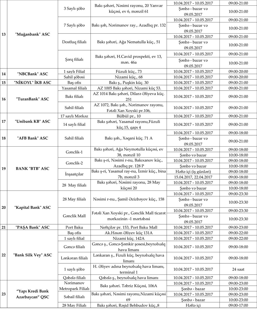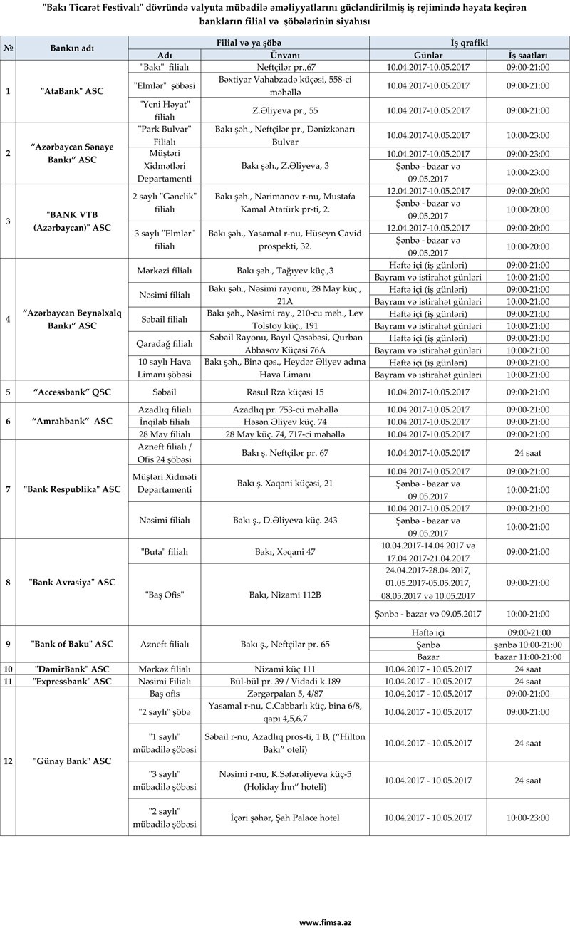Festival zamanı valyuta mübadilə əməliyyatlarını gücləndirilmiş iş rejimində həyata keçirən bankların filial və şöbələri MBNP-nin rəsmi internet səhifəsində yerləşdirilmişdir.