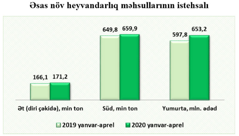 Dövlət Statistika Komitəsinin aylıq hesabatında bildirilir ki, 2019-cu ilin müvafiq dövrünə nisbətən ət istehsalı 3,0 faiz, süd istehsalı 1,5 faiz, yumurta istehsalı 9,3 faiz artmış, yun istehsalı isə eyni səviyyədə qalmışdır.