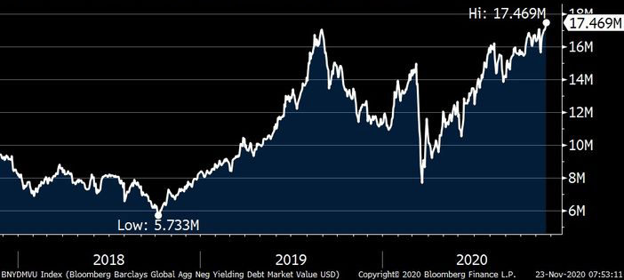 Marja xəbər verir ki, Bloomberg Barclays Mənfi Gəlirlilikli Borc Bazarları İndeksinə görə, mənfi faizli istiqrazların cəmi dəyəri 17,5 trilyon dollara çataraq indiyədək ən yüksək səviyyəsinə çatıb.