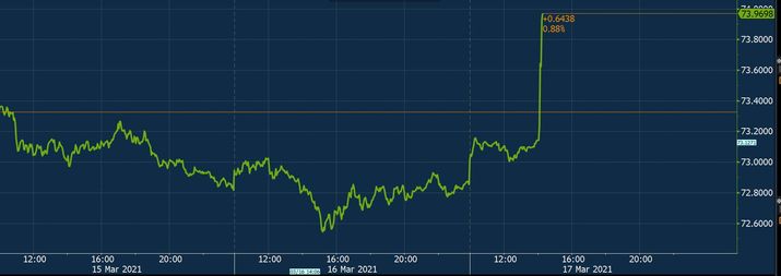 Курс доллара вырос до 74 руб., поднявшись по сравнению с закрытием вчерашних торгов более чем на рубль. Отметки ₽74 курс американской валюты достиг впервые с 10 марта.