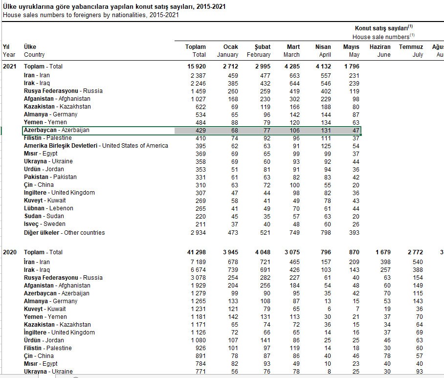 2021-ci ilin yanvar-may aylarında azərbaycanlılar Türkiyədə 429 mənzil alıblar. 2020-cu ilin eyni dövründə azərbaycanlılar Türkiyədə 361 mənzil almışdılar.