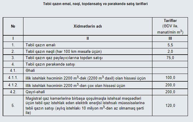 Tarif Şurasının yeni qərarı ilə istehlak həcmi kateqoriyasının sayı 3-ə çatdırılıb. 1 kub metri 10 qəpik olan 2200 m3-dək olan hissə 1000 m3 azaldılaraq 1200 m3-ə endirilib. 1200 m3-dək (1200 m3 daxil) olan hissəs üçün tarif 1 kub metri 10 qəpik, istehlak edilən qazın 1200 - 2500 m3 (2500 m3 daxil) olan hissəs üçün 1 kub metri 20 qəpik, 2500 m3-dən çox olan hissəs üçün isə 1 kub metri 25 qəpik müəyyənləşdirilib.