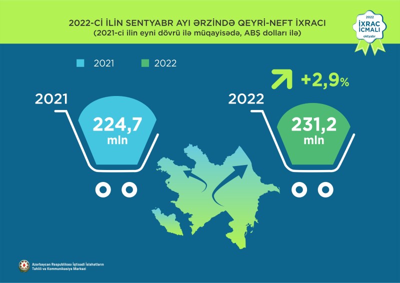 İqtisadi İslahatların Təhlili və Kommunikasiya Mərkəzinin təqdim etdiyi “İxrac icmalı”nın oktyabr sayına görə, 2022-ci ilin yanvar-sentyabr aylarında Azərbaycanın ümumi ixracı 29,5 milyard ABŞ dolları, qeyri-neft sektoru üzrə ixrac 2,1 milyard ABŞ dolları təşkil edib.