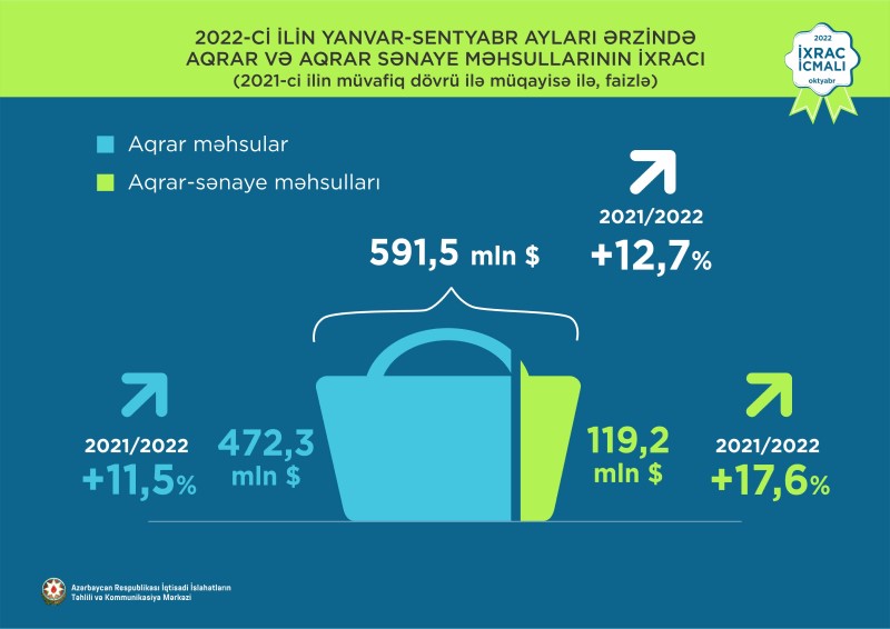 Aqrar və aqrar sənaye məhsulları üzrə birgə ixracın statistik dəyəri 591,5 milyon ABŞ dolları təşkil edib. 2022-ci ilin yanvar-sentyabr ayları ərzində ixrac edilən meyvə-tərəvəz məhsulları aqrar məhsullar qrupunun 92,9%-ini təşkil edib. Qeyri-neft-qaz ixracının tərkib hissəsində əhəmiyyətli yer tutan aqrar-sənaye məhsullarının yaratdığı əlavə dəyər ötən ilin müvafiq dövrü ilə müqayisədə 17,6% artıb.