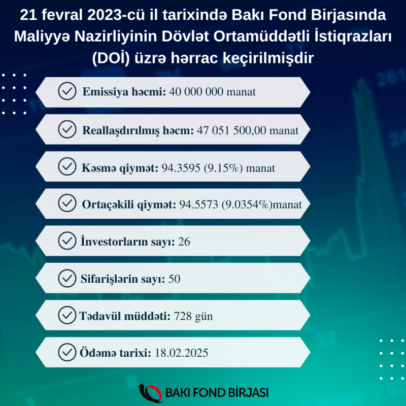 21 fevral 2023-cü il tarixində Bakı Fond Birjasında Azərbaycan Respublikası Maliyyə Nazirliyinin AZ0201040042 ISIN-li, 40 milyon manat həcmində, 728 gün tədavül müddətli dövlət ortamüddətli istiqrazlarının (DOİ) yerləşdirilməsi üzrə hərrac keçirilib.